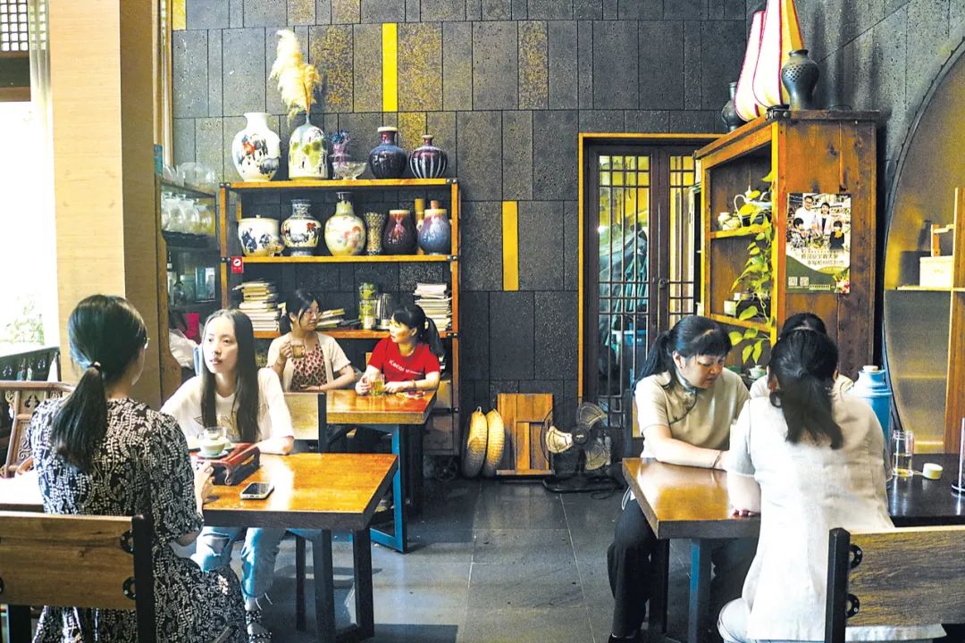 开心茶馆由前高档会所“西湖会”转型而来,随着“会所中的歪风”被严肃整治,杭州西湖曾被“垄断”的美景对民众打开了平价大门。图为茶馆大堂内市民游客喝茶休息。(浙江省杭州市纪委监委供图)